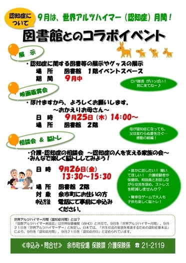 「国際アルツハイマー病協会」は世界保健機関(WHO)と共同で、毎年9月21日を「世界アルツハイマーデー」と制定し、9月を「世界アルツハイマー月間」と定め、認知症についての知識の普及活動を実施しています。町では、この世界アルツハイマー月間に併せて、図書館と共同で認知症関連イベントを開催します!